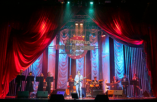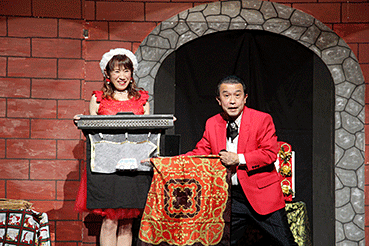 CB X’masのラストを飾る、荒木バンドをセットする間、舞台前面(中幕前)に背景となる装置を置いて、小さなステージを作り、お客様に楽しんでいただく「山田劇場」と呼ばれているコーナーを担当しています。