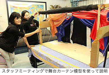 自分で考えることは難しく、照明の田中さんに相談させてもらいに行きました。田中さんの事務所にある簡易紗幕を見せて頂いたりもしましたが、小さ過ぎです。あの、大きなステラボールを一面に埋め尽くす紗幕・・・やはり作るしかないのか・・・。っと思っていたら、田中さんが「レンタルってあるんじゃない!?」「きっと、こんな風に困っている人、他にもいるはずだから」っと。
