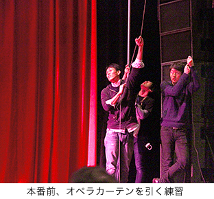 今年は、カーテンが舞台を彩ります。しかし、ステラボールの広さのカーテンを取り付けるのには、相当な時間がかかり、照明の準備も押せ押せになってしまいました。