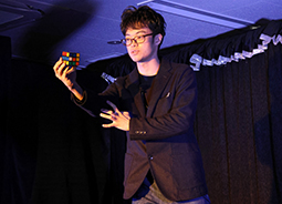 出演者は、ROYCE(ロイス)さん。ルービックキューブを使ってのマジック。2つのキューブを使い、お客様がバラバラに混ぜたキューブがロイスさんの混ぜたキューブの色と一致したり、一瞬にして色を揃えたりとキューブを自在に操っていました。