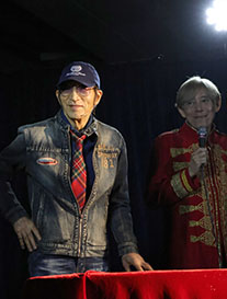 トップバッターは、石黒サンペイさん&ヨンペイさん親子。ステージ中央にはアメリカの国旗が。ミステラさんによると「サンペイさん親子が来る予定だったのですが、仕事で来られなくなり、代役として急遽アメリカからキング・オブ・ロックのスーパースターが来日」と。