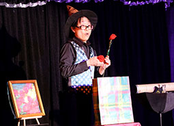さあ、例会スタートです!オープニングを飾るのは、司会のミステラさん。ハロウィンの衣装でほうきに乗って登場すると、次々とバラの花びらを出すマジックを披露。さらに、バラの色を赤から黄色へ変え、フィナーレではご自身のベストの色まで変えてしまうという、まさに摩訶不思議なマジックで会場を大いに盛り上げてくださいました。