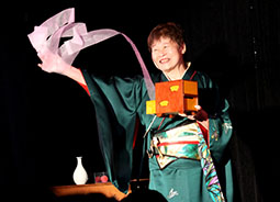 和装姿のひとみさん、照明も相まってか、司会の時とは違う表情で妖艶で素敵な和妻を披露。この鶴出しのマジックは必見で、美しいだけでなく、いくつ鶴が出たのかというくらいの数が出現していて不思議でした。