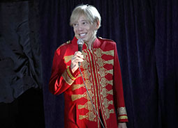 いよいよ例会のスタートです。まずは司会のミステラさんの登場です。いつもとは違う雰囲気で、かっこいい衣装に身を包みオープニングマジックを披露されました。