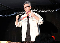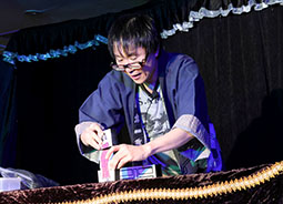 まず1人目は沙門零さんです。お客様を2名ステージに上げ、赤と白の2本のロープを使い縁結びのマジックと称し演じられました。赤と白のひもを1人づつ渡し、指示通りにやっているとそのひもが結ばれたり、円ができたりと不思議な現象が起き、まさに縁結びのマジック。最後のオチも面白く、関西人ならではの楽しいトークもあり、客席は笑い声に包まれていました。