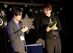 最後に登場したのは、一太郎さん。5本の色の付いた割り箸を使ってのメンタルマジック。トークの中にも小ネタのギャグを入れ、短い時間ながら一太郎ワールド全開のステージでした。大爆笑です〜
