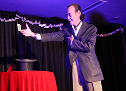 さあ、例会スタートです!オープニングを飾るのは、司会のミステラさん。ハロウィンの衣装でほうきに乗って登場すると、次々とバラの花びらを出すマジックを披露。さらに、バラの色を赤から黄色へ変え、フィナーレではご自身のベストの色まで変えてしまうという、まさに摩訶不思議なマジックで会場を大いに盛り上げてくださいました。