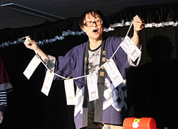 和装姿のひとみさん、照明も相まってか、司会の時とは違う表情で妖艶で素敵な和妻を披露。この鶴出しのマジックは必見で、美しいだけでなく、いくつ鶴が出たのかというくらいの数が出現していて不思議でした。