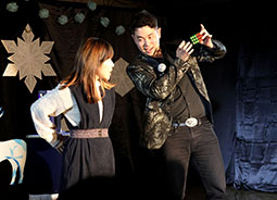 いよいよ本格的マジックに〜。ウォーミングアップとして、魔法の杖を使い、 腕、肘、手の平、ひざ、指など身体の関節や各部位を使ってのボディマジック。指が増えるマジックは必見です!会場からは 「え〜!」と驚きの声がわいていました。