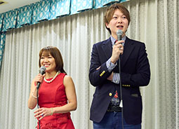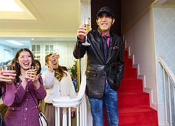 近づく乾杯の時間。ゲストの方々も集まってきて、全員が今か今かと待つ中、黒のジャケットに、パープルのワイシャツ・ネクタイと、オシャレでかっこいい荒木先生の登場です!その瞬間、参加者全員の笑顔がこぼれ、とても幸せな空間になりました。